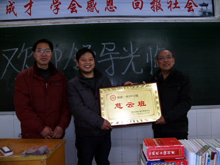 130  ,阳新一中2012级“慈云班”授牌典礼在高一(16)班教室举行。黄石市慈云助学服务中心刘昌明主任,阳新慈善总会办公室陈瑞芝主任,阳新一中梁师稳副校长,阳新一中慈善助学办公室周升发主任,高一(16)班班主任尹传仁老师参加了授牌典礼。典礼由阳新一中副校长梁师稳主持。
