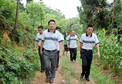 由于太平山海拔1300多米,且山路崎岖,客车无法上山。在向导的带领下,大家都开始步行上山。一条不知名的河流蜿蜒而下,上山的公路就修在河岸。沿途走来,两岸崇山峻岭,茂林修竹,清流激湍,映带左右,真是美不胜收。一行的党员同志都对这里的竹海清流赞不绝口,对这里清新的空气感叹不已。甚至有些羡慕这里的好风景,好环境。随行的向导说,这里的风景是很好,但是以前没修公路时,都是步行,翻山越岭,很不方便。