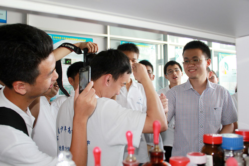 志愿者组织营员分组参观了资源学院、地学院和生物地质与环境地质国家重点实验室。营员们不仅聆听了专业老师对学院、实验室的详细介绍,而且还重点走访了构造与油气资源实验室、矿石学实验室及采油工程实验室、显微镜室、构造园、矿物园、有机地球化学室、显微结构室、Micro—CT 室等。矿物园各种奇异的矿石标本深深吸引了他们。专业老师关于构造地质学的讲解给营员们留下了深刻印象。讲解中提到,构造地质学很重要,它能帮助人们认识、观察和分析各种构造地质现象,考察各类天然变形构造的形成机理及其构造物理环境。老师的讲解激发了营员们将来从事这方面科学研究的兴趣。在了解知识的同时,实验室老师也给同学们了一次动手实践的机会,在八楼微生物室,老师引导同学们分别做了微生物室培养细菌实验和硫酸还原菌产生硫化氢气体的实验。由于实验需要反应过程大概24 小时,老师提示有兴趣的同学可以于明天下午同一时间来观察实验结果。