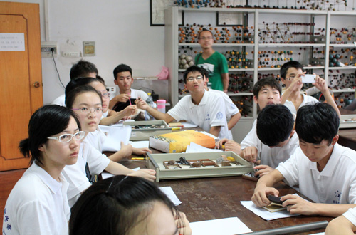 桌上整齐的岩石标本。对于这些高中生们来说,岩石标本以前可能只存在于博物馆里,被厚厚的玻璃所阻挡,如今,标本直接展露在自己的眼前,而且可以亲自研究,兴奋好奇之感溢于言表。