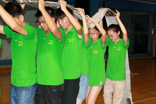 登山报告给同学们留下了深刻的印象,同学们对晚上的活动也更加憧憬。晚饭过后,同学们就早早的来到地大体育馆,为晚上的活动做准备了。7 点同学们在体育老师的指导下整齐的进入体育馆。进入体育馆首先进行了团队拓展训练,这 是为了让同学们意识到团队的力量比个人的力量大,将“1+1>2”的道理深入他们的心里。