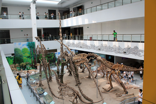 生命一直是大家津津乐道的话题,在生命起源与进化展厅里,讲解员从生命起源的几种假设理论谈起,先后引导大家参观了埃迪卡拉动物群、澄江动物群化石,而石炭纪的“大蜻蜓”更是引发大家的一阵阵惊叹。其实在这个展厅最吸引大家眼球的,莫过于恐龙骨架化石了。和平永川龙、鱼龙、鹦鹉嘴恐龙、马门溪龙,每一个都有它的独特性。