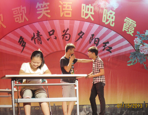武汉的三伏天,晚饭过后依旧不饶人。大约7 点,老年人活动中心无不弥漫着热闹的气氛,有的同学正在准备着即将演出的节目,有的同学正兴致勃勃地议论着自己要表演的节目。