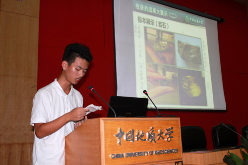 大约三点,地大分营优秀自主科研项目暨闭营仪式正式开始。首先,每个班级拿出自己的科研成果,向现场观众边用ppt讲解,边展示实物,让在场的营员赞叹不已,活泼、搞笑的演示方式,让大家捧腹大笑。他们的形象力、科学梦想让我们对祖国的未来多了一份期待。我校的刘世民同学代表1班科研小组发言,现场反应强烈,赢得了在场师生的赞赏。